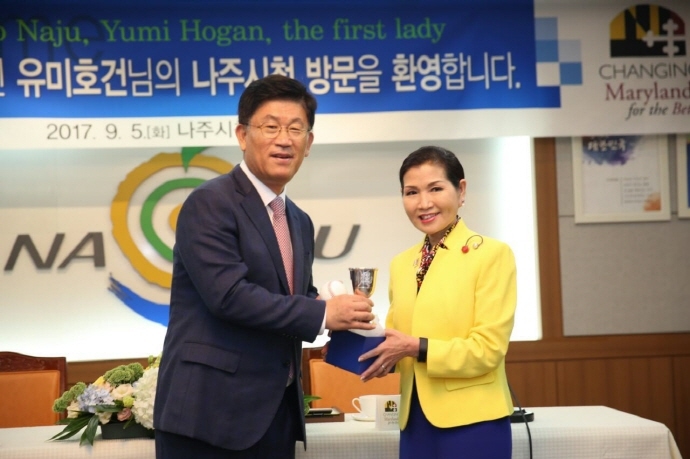 이에 유미호건 여사는 “짧은 기간이지만, 꼭 고향에 와야겠다는 생각을 했고, 전라남도에 오자마자 나주를 가장 먼저 찾아왔다”며, “메릴랜드주와 나주시가 더욱 활발한 친목과 교류, 좋은 일들이 많이 생길 수 있도록 래리 호건 주지사의 퍼스트레이디로써 노력해가겠다”고 전했다.