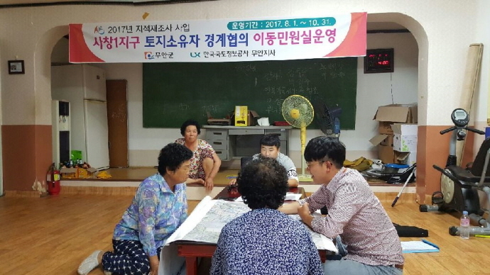 무안군은 2017년 지적재조사사업지구인 몽탄면 사창1지구 마을회관 및 현경면 평산1지구 원평산 마을회관에서 지적재조사 이동민원실을 설치해 토지소유자들과의 경계협의를 추진하고 있다고 밝혔다.