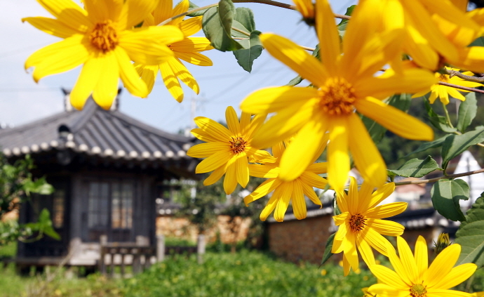12일 전남 함평군 함평읍 이재혁 가옥에 좁은입 해바라기가 활짝 펴 고택과 어우러져 한 폭의 동양화 같은 장관을 연출하고 있다.