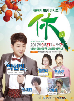 올해로 6회째를 맞는 '가을밤의 힐링 휴(休) 콘서트' 공연은 남악신도시 활성화에 따른 무안군민의 자긍심 고취와 화합을 위해 군에서 마련한 야외 음악공연으로 군민을 위한 문화예술 축제의 장으로 펼쳐질 예정이다.