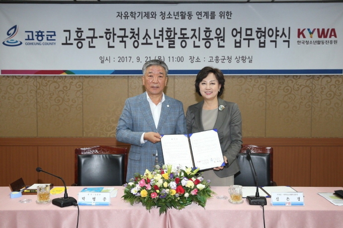 고흥군이 21일 군청 상황실에서 한국청소년활동진흥원(KYWA, 이사장 신은경)과 자유학기제 프로그램 보급 및 청소년활동연계 협력 등을 위한 업무협약을 체결했다.