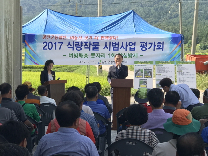 강진군이 지난 21일 식량작물 시범사업 평가회를 신전 수양 들녘에서 농업인과 관련공무원 90명이 참석한 가운데 개최했다.