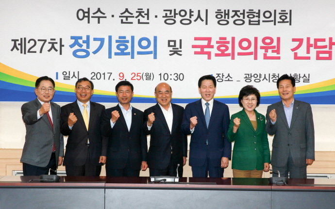 광양만권 상생발전을 위해 운영하고 있는 여수·순천·광양시 행정협의회(회장 정현복 광양시장)는 9월 25일 제27차 정기회의와 국회의원 간담회를 개최했다.