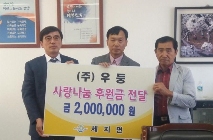 나주시 세지면 송제리에 위치한 발효사료업체인 (주)우둥(대표 윤태수)은 지난 25일 세지면 지역사회보장협의체에 사랑 나눔 후원금 2백만 원을 기탁하며, 매월 30만원의 정기적인 후원을 약속했다.