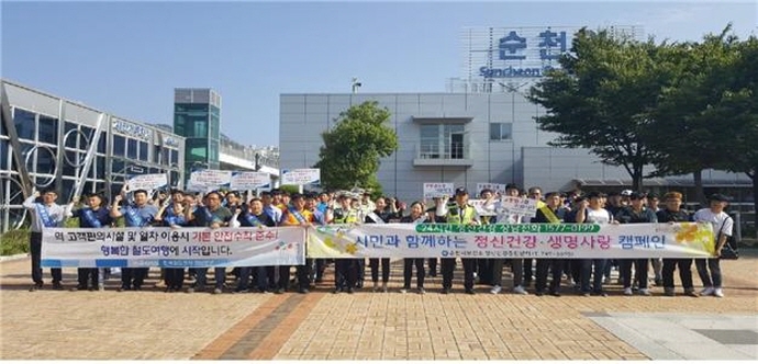 코레일 전남본부는 '9월 철도 교통안전의 달'을 맞아 27일 순천역 광장일원 및 관내 주요 건널목에서 유관기관 합동으로 철도교통 안전문화 정착 및 생명존중 자살예방을 위한 대국민 캠페인을 시행했다.