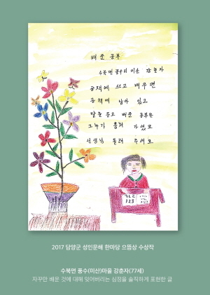 또 문해학습자 시화작품 우수작 34편은 오는 9월 30일부터 10월 9일까지 담빛예술창고 카페에서 전시회를 갖고 추석명절에 관광객과 출향인들에게 선보인다.