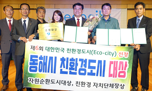 강원 동해시(시장 심규언)는 27일 서울신용보증재단 대강당에서 (사)한국환경정보연구센터(회장 이재성)가 주최한 ‘제6회 대한민국 친환경도시대상, 에코시티’ 시상식에서 ‘친환경도시종합대상, 자원순환도시대상, 단체상’ 등 3개 부문에서 대상을 수상했다.