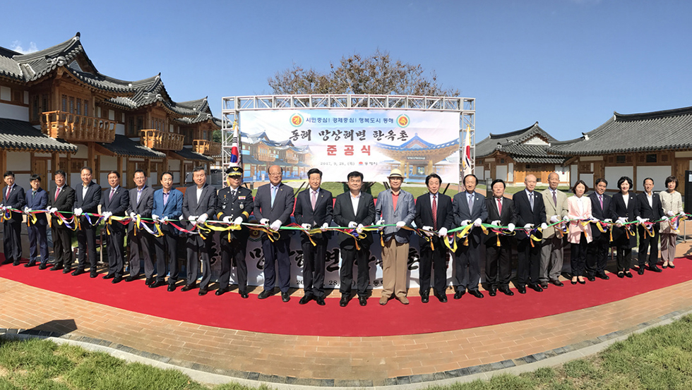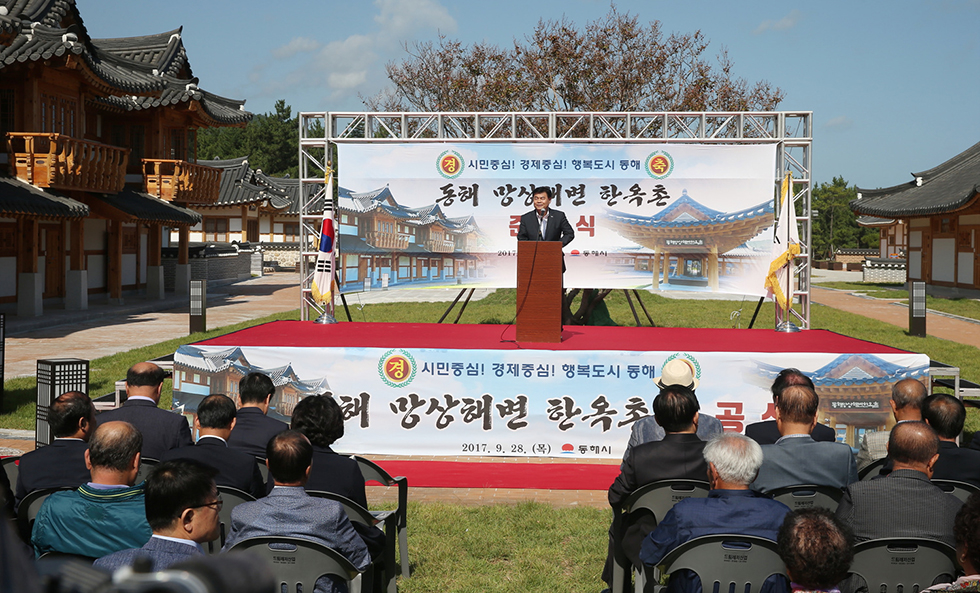 ▲28일 강원 동해시 망상동 망상해변에 80억8000만 원을 들여 연면적 1311㎡ 규모로 조성한 동해 망상해변 한옥촌 준공식이 심규언 동해시장을 비롯한 기관단체장 등이 참석한 가운데 준공식을 하고 있다. ⓒ동해시