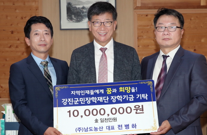 지난 28일 (주)남도농산 전병하 대표가 강진군민장학재단 장학기금 1천만원을 기탁했다.