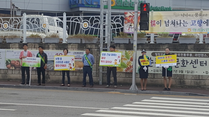 이번 캠페인은 추석명절을 앞두고 스스로 정지선 및 교통 신호를 준수하는 운전자에게 엄지척 칭찬 및 보행중 스마트 폰 안하기, 교통신호 위반 안하기 등 교통신호 준수를 유도하기 위한 홍보물과 피켓, 어깨띠, 현수막 등을 적극 활용하여 군민들이 쉽게 캠페인에 동참하도록 했다.