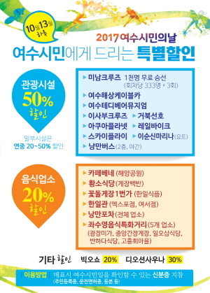 여수시(시장 주철현)에 따르면 여수시민의 날 기념행사가 열리는 13일 지역 관광업계가 관광 활성화에 따른 불편을 감내해온 시민들을 위해 자발적인 할인 행사를 실시한다.