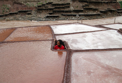'홍염 마을'이라는 자다 마을의 별칭은 이 지역 흙이 붉은 빛을 띤다고 해서 그렇단다. 자다 마을은 티벳족의 일종인 장족(藏族) 사람들이 살고, 옌징 마을에는 나시족(納西族) 사람들이 산다고 했다. 1000년 전에는 이들 사이에 소금을 두고 전쟁까지 벌어졌다니, 과연 산간 벽두인 이 곳 티벳과 윈난성에서 소금이 얼마나 귀했는지 보여주는 사료 같다. 육지 소금은 과거 이 곳이 바다였음을 보여준다. 확실하진 않지만 가장 인정받는 학설이란다. 히말라야가 융기하면서 바닷물이 흙에 그대로 섞여 들어갔다는 것이다. 그래서 이 곳 '우물'에서는 '소금'이 난다.