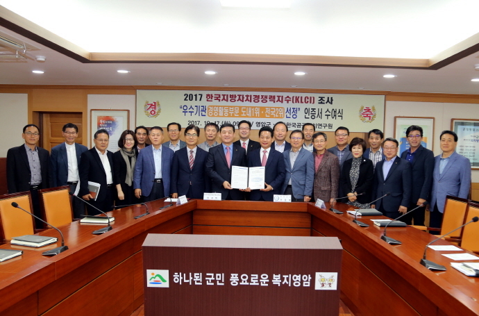 영암군은 2017 한국지방자치경쟁력지수(KLCI) 조사 결과, ‘경영활동’ 부문에서 전국 82개 군 단위 중 2위(도내1위)에 선정되어 지난 17일 우수기관 인증서를 수여 받았다.