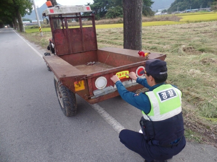 담양경찰서(서장 황석헌) 수북파출소는 최근 가을 수확철을 맞아 들녘과 도로변에 많이 운행하는 농기계 교통사고 예방을 위해 마을별 순찰활동을 하면서 경운기 등 농기계에 태양열 경광등과 반사지 등을 부착하고 있다.
