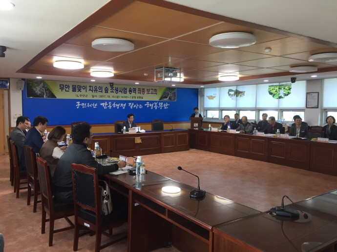 무안군은 지난 13일 군청 상황실에서 ‘무안 물맞이 치유의 숲 조성’ 용역 최종보고회를 개최했다.