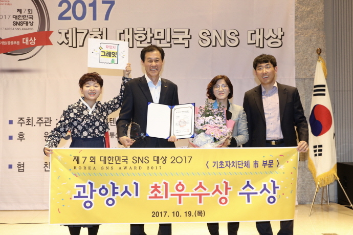 광양시가 10월 19일 서울시 중구 LW컨벤션에서 열린 2017 대한민국 SNS 대상에서 기초지자체 市 부문 최우수상을 수상하는 영예를 안았다.