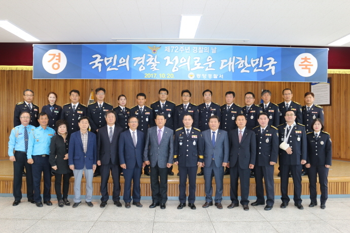 광양경찰서(서장 박종식)는 20일 오전 11시 경찰서 4층 대회의실에서 경찰서장을 비롯하여 과·계장, 직원들과 경찰협력 단체장 등 120여 명이 참석한 가운데 '제72주년 경찰의 날' 기념식을 개최했다.
