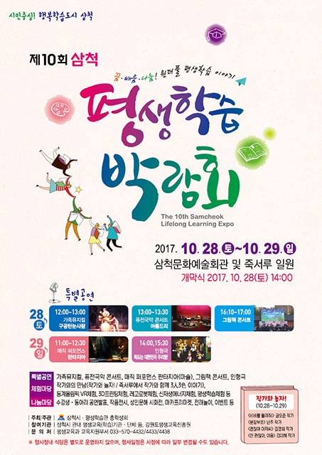 평생학습도시 강원 삼척시가 오는 28, 29일 이틀 간 삼척문화예술회관 및 죽서루 일원에서 ‘제10회 삼척평생학습박람회’를 개최한다.