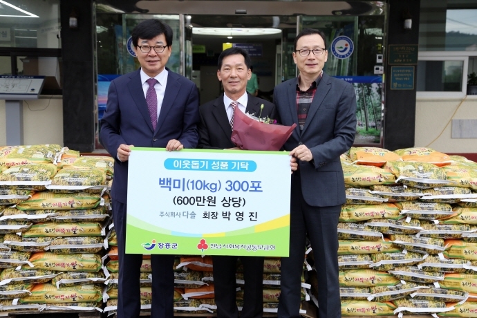 장흥바이오식품 산단에 입주 기업인 ㈜다솔(회장 박영진)에서 장흥군(군수 김성)에 올해 봄에 이어 두 번째로 백미 10kg 300포 600만원 상당을 이웃돕기 성품으로 기탁했다.