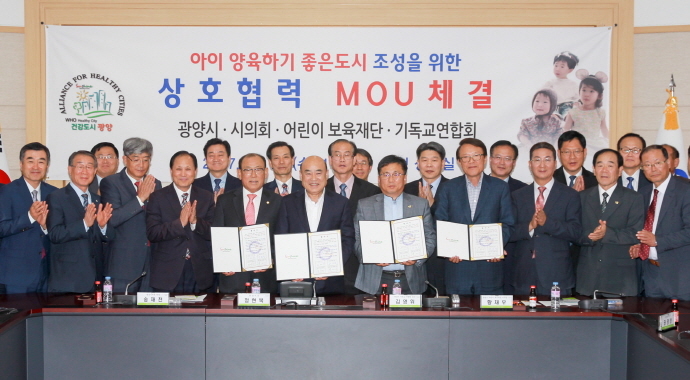 시는 10월 25일 시청 상황실에서 정현복 광양시장과 송재천 광양시의회의장, 황재우 (재) 광양시 어린이보육재단 이사장, 김영위 기독교 연합회장 등 40여 명이 참석한 가운데 MOU를 체결했다.