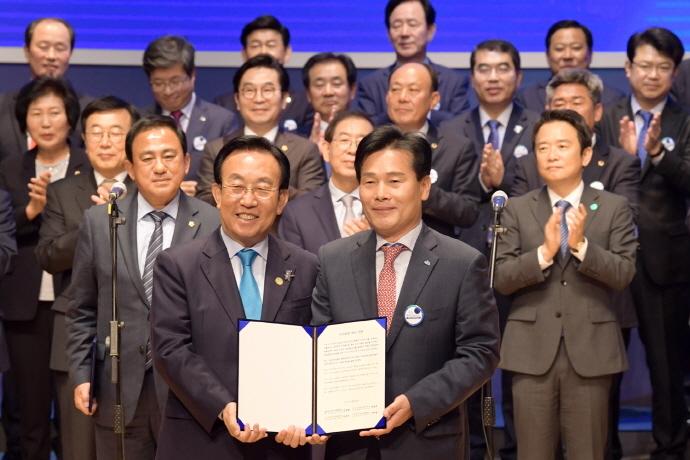 이날 박람회장 엑스포홀에서 열린 지방자치의 날 기념식에 참석한 대한민국시도지사협의회장 등 4대 협의체장은 선언문을 낭독한 후 이를 주철현 여수시장에게 전달했다.
