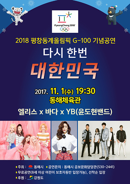동해시가 주최하는 이번 공연은 2018 평창동계올림픽 G-100일을 기념하고 평창동계올림픽 성공 개최를 기원하는 전 시민의 열정을 담아 다시한번 대한민국을 응원하고자 참가자 모두가 하나 되는 의미를 담고 있다.