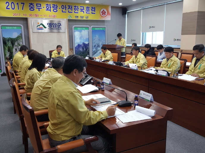영암군(군수 전동평)은 30일 영암군 재난종합상황실에서 지진으로 인한 다중밀집시설 대형화재 및 붕괴를 가정하여 2017 재난대응 안전한국훈련 도상훈련을 실시하였다.
