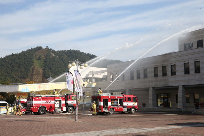 군은 이번 실제훈련을 대비하여 지난 10.31일 군청상황실에서 13개 유관기관 협업부서가 참여하여, 대형화재 발생 시 기관단체별 임무와 역할을 발표하고 토론을 거쳐 재난대응 매뉴얼을 점검하고 개선방안을 마련하는 토론 훈련을 가졌다.