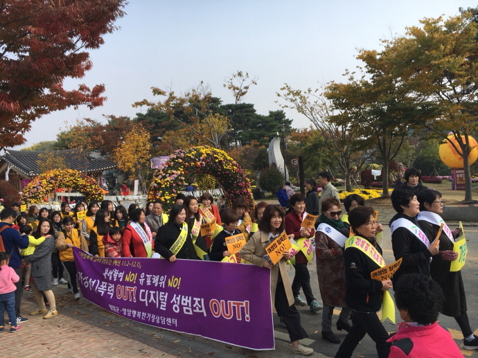 또한, 기찬랜드 국화축제장에서 여성 폭력 근절을 위해 10월28일부터 11월12일까지 홍보부스를 운영하며, 가두행진 캠페인을 시작으로 여성 폭력뿐만 아니라 모든 가정폭력과 성폭력 근절(디지털 성범죄)에 대한 사회적 인식개선과 예방문화 확산을 위해 다방면으로 노력할 예정이다.