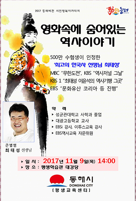 강원 동해시(시장 심규언)는 올해 마지막 시민행복 아카데미를 오는 9일 오후 2시 평생학습관에서 500만 수험생이 인정한 ‘EBS 최고의 한국사 선생님’ 큰별 쌤 최태성 선생님을 초청해 ‘영화 속에 숨어있는 역사이야기’라는 주제로 강연을 가진다.