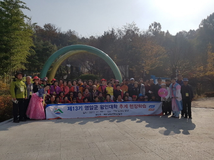 이번 현장학습은 왕인대학 수강생 어르신 90여명이 참가하였으며, 늦가을 오색찬란한 단풍잎 정취 속에 소설 춘향전의 무대가 된 남원 광한루원과 춘향테마파크를 견학하며 뜻 깊은 시간을 가졌다.
