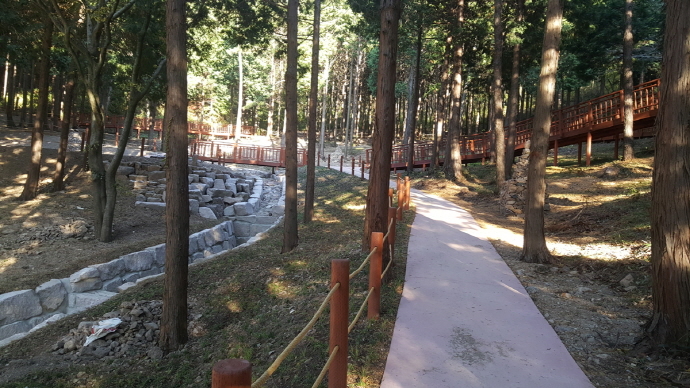 무장애 숲길은 자연 훼손을 최소화하기 위해 황토포장과 데크로드 구간을 연결, 경사가 거의 없는 둘레길 형태로 1.2㎞를 조성되었으며, 이용객 편의를 위해 나무와 초화류 식재는 물론 쉼터, 의자, 돌탑 등의 편의시설도 함께 만들었다.