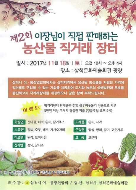 강원 삼척시 이·통장 연합회(회장 박금식)는 오는 18일 오전 10시 문화예술센터 엑스포 광장에서 ‘제2회 농산물 직거래 장터’를 갖는다.