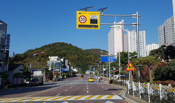 여수시(시장 주철현)가 어린이보호구역에 과속경보시스템을 설치하며 초등학생들의 안전한 등하교를 돕고 있다.