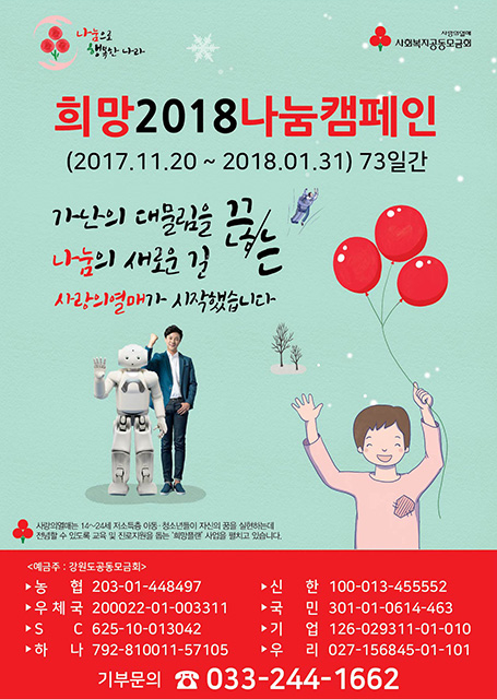 강원 동해시(시장 심규언)와 강원사회복지공동모금회(회장 한만우)는 연말연시를 맞아 ‘희망 2018 나눔 캠페인’을 전개한다고 밝혔다.