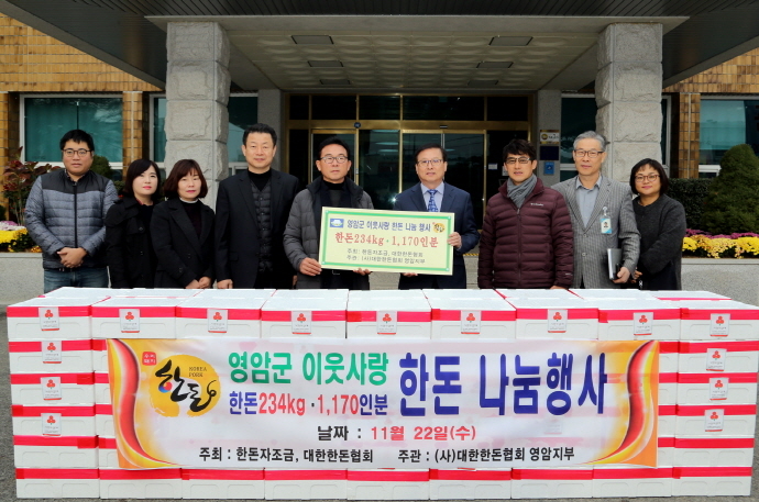 대한한돈협회 영암지부(지부장 임성주)에서는 돼지고기 234kg(2kg×117박스, 200만원 상당)을 영암군에 지정기탁하여 어려운 이웃에게 전달해 줄 뜻을 전했다.