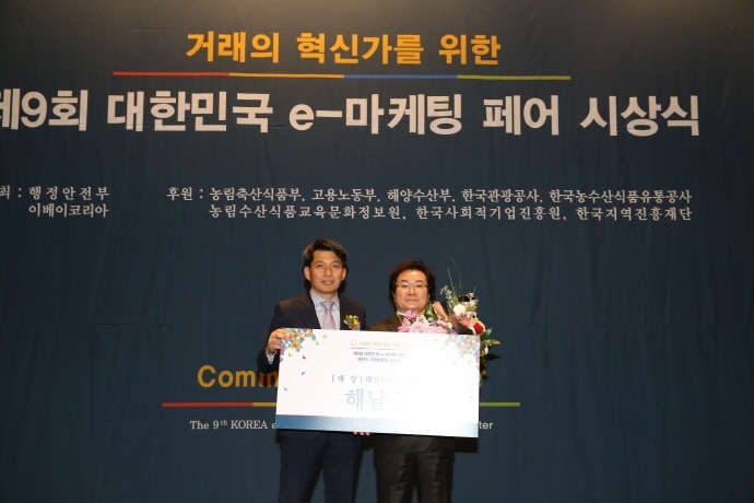해남군이 온라인 농수특산물 홍보 및 판매를 통한 지역경제 활성화 우수사례를 평가하는 제9회 대한민국 e-마케팅 페어에서 해양수산부문 대상을 수상했다.
