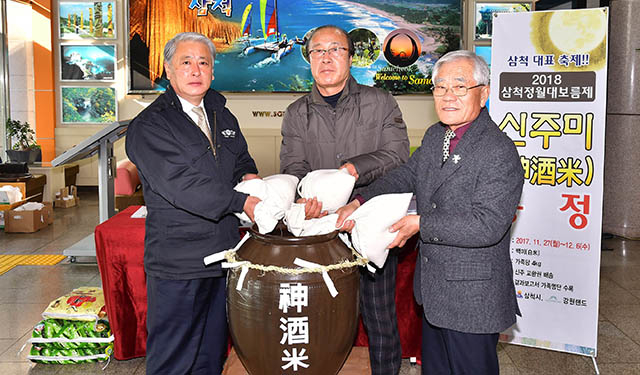 강원 삼척정월대보름제위원회는 삼척지역 전통행사인 2018 삼척정월대보름제 행사기간 중 제례행사에 쓰일 신주를 마련코자 27일 삼척시청 본관 로비에서 신주미(神酒米) 봉정식을 가졌다.