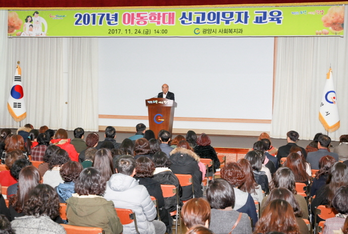 광양시는 지난 11월 24일 시청 대회의실에서 아동학대의 조기발견을 통한 예방과 근절을 위한 ‘2017 아동학대 신고의무자 교육’을 실시했다고 밝혔다.