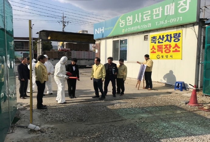 특히, AI 발생 직후인 지난 11월 20일부터 순천광양축협 사료판매장(광양읍 유당로 6)에 거점소독시설을 설치해 광양시로 진출입하는 가금류 관련 축산차량과 운전자에 대한 소독을 24시간 실시하고, 소독필증을 발급하고 있다.