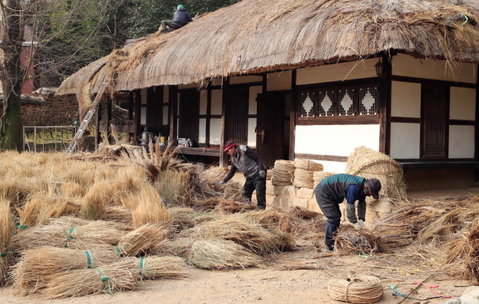 을씨년스런 날씨를 보인 지난 29일 전남 강진군 강진읍 탑동마을의 남도 서정시의 대가 영랑 김윤식 생가(국가 지정 중요민속자료 제252호)의 초가지붕 이엉을 새롭게 단장하는 인부들의 손놀림이 분주하다.
