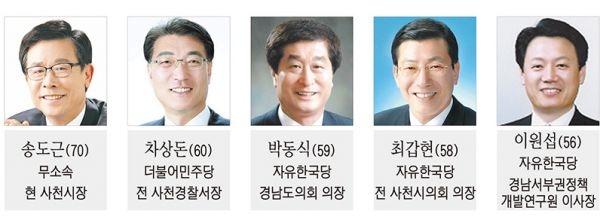 현재 사천시장 출마를 저울질 중인 후보는 5명에 이른다. 타천으로 거론되는 후보들이 몇 있긴 하지만 실제 출마로 이어질 가능성은 낮아 보인다.