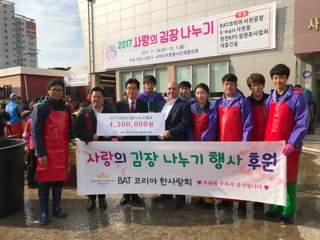브리티쉬 아메리칸 토바코 코리아(이하 BAT 코리아)가 BAT 사천공장이 위치한 경상남도 사천시에서 ‘2017 사랑의 김장나누기 행사’에 참여해 450만 원을 후원하고 김장 나눔 봉사활동을 펼쳤다.