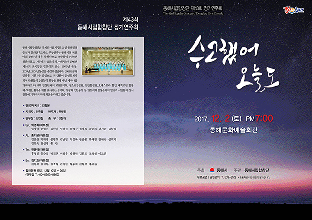 올해 43회째인 이번 연주회를 통해 민종홍 지휘자 등 43명으로 구성된 동해시립합창단이 각박한 일상에 지친 동해시민에게 잠시나마 마음의 위안과 감동을 주는 대표적인 합창곡을 엄선해 선보이게 된다.