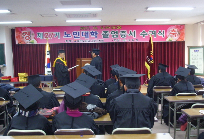 대한노인회 나주시지회(지회장 서정윤) 부설 노인대학(학장 박학수)에서는 12월 6일 지회 회의실에서 제 27기 노인대학 졸업식을 개최했다.