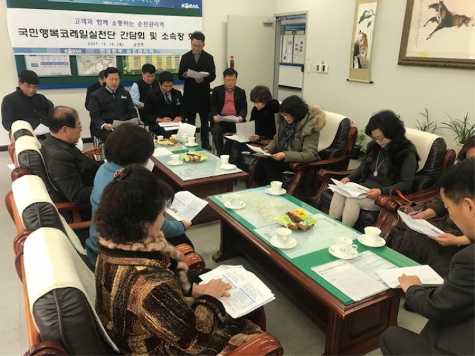 ‘국민행복코레일실천단’은 지역과 철도의 동반성장 및 발전을 도모하는 언론인, 학계, 여행업계, 여성단체 등 지역 오피니언 리더로 구성된 고객 참여형 소통조직으로 이번 간담회를 통해 2017년 연말 활동실적을 공유하고 앞으로 좀 더 적극적인 고객서비스 활동과 전남지역을 대표하는 철도관광 상품홍보를 위한 토론을 했다.