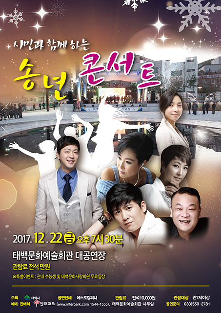 태백문화예술회관 대공연장에서 열리는 이번 송년콘서트는 김경옥 아나운서의 사회로 국내 가요계를 평정한 ‘샤방샤뱡’의 박현빈, ‘흔들린 우정’의 홍경민, ‘아 대한민국’의 정수라를 비롯해, 태백 출신 가수 ‘보약같은 친구’의 신용, ‘호접몽’의 도현아가 출연해 공연의 흥을 더할 예정이다.