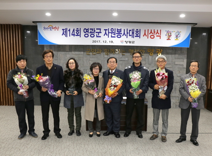 영광군은 지난 19일(목) 제14회 영광군 자원봉사대회에 참여한 단체 중 7개 단체와 2017년 한 해 동안 영광군민을 위해 봉사활동을 한 우수자원봉사자 5명에 대한 시상식을 가졌다.