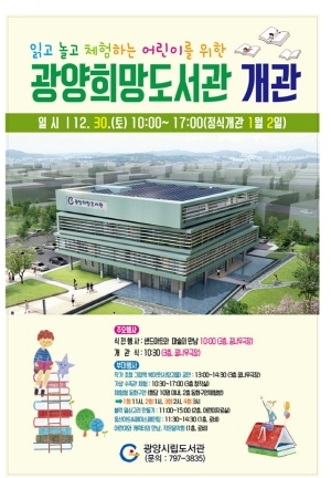 지상 3층 규모로 광양읍사무소 건너편에 지어진 광양희망도서관은 어린이들이 읽고 놀고 체험하며 상상력과 창의력을 기를 수 있는 공간으로 구성됐다.