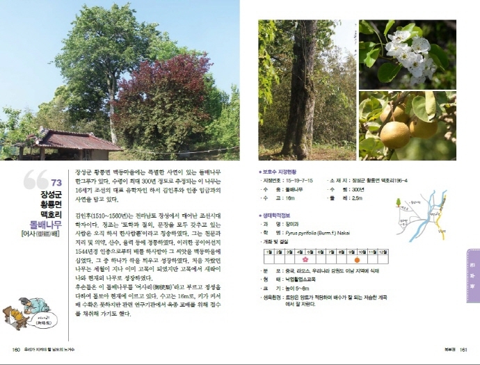 전라남도산림자원연구소는 이와 연계해 ‘2018년 전라도 정도(定都) 천년’을 기념해, 한 자리에서 수 백 년간 마을을 지켜온 전남지역의 노거수를 사진과 그림으로 담아내 ‘우리가 지켜야 할 남도의 노거수’ 책자를 발간했습니다. 또 마을 어르신들을 통해 들을 수 있는 가슴 훈훈한 이야기 등을 스토리텔링으로 엮어 각 나무마다 품고 있는 역사·문화적 사연도 함께 실었습니다.